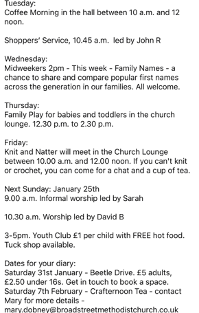 Fuller details of events and the welcome to be found at Broad Street Methodist Church can be found on their website: www.broadstreetmethodistchurch.co.uk.